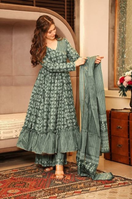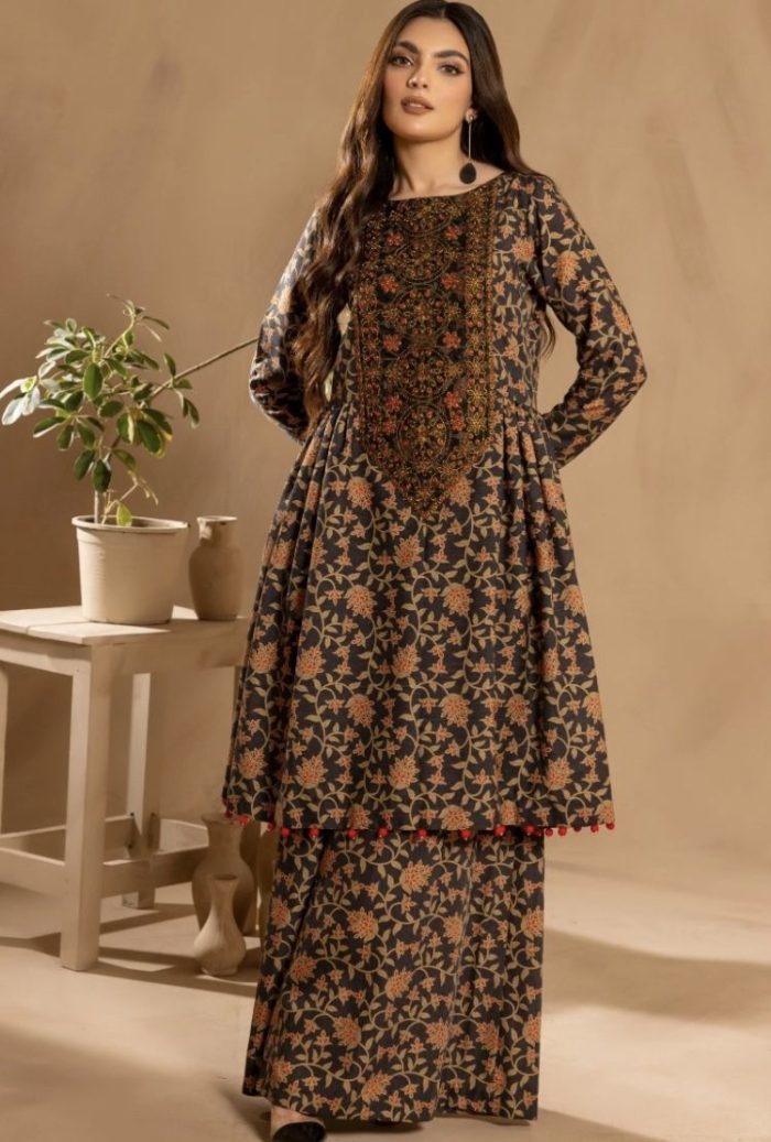 Choclate Brown Linen Frock Embroidered with Shafoon Dupatta.